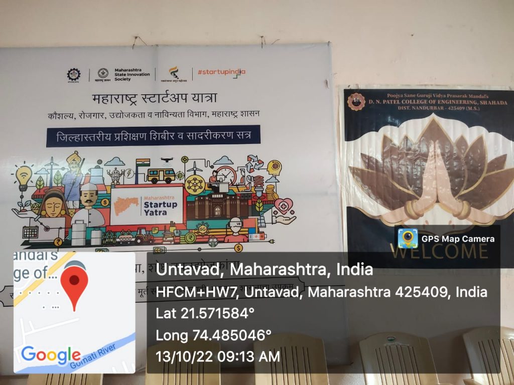 | 2 | Maharashtra Startup Yatra 2022 | Tr13 Oct. 2022 | BOOT Camp, Startup India | V. R. Rise (Asst. Comm.) | State Government at D. N. Patel College of Engineering |